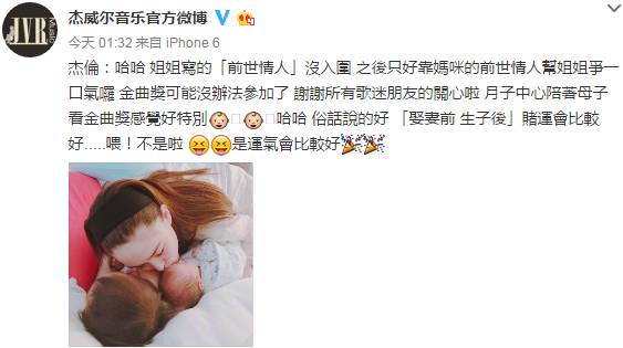 杰伦说:“......金曲奖可能没办法参加了.......月子中心陪着母子看金曲奖感觉好特别......俗话说得好,娶妻前、生子后,赌运会比较好......喂!不是啦,是运气会比较好。”
